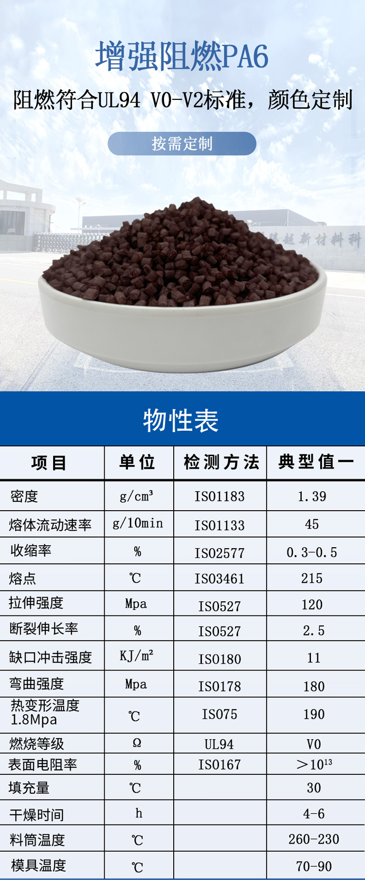 主成分由PA6、阻燃劑、玻纖組成。在原樹脂基礎(chǔ)上提高強(qiáng)度,賦予材料阻燃性能。有溴系阻燃、紅磷阻燃、無鹵阻燃(氮、磷系),應(yīng)用于電子電器、石油化工、天然氣行業(yè)、冶金行業(yè)、消防救援、公共場(chǎng)所、交通運(yùn)輸?shù)刃袠I(yè)
